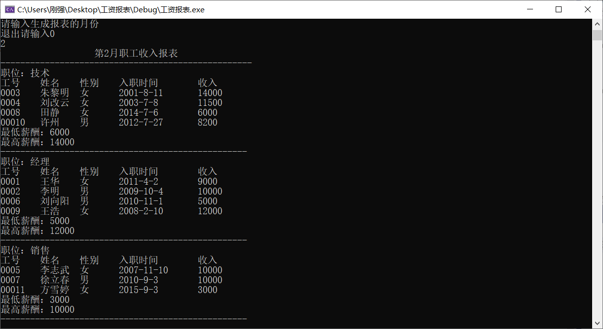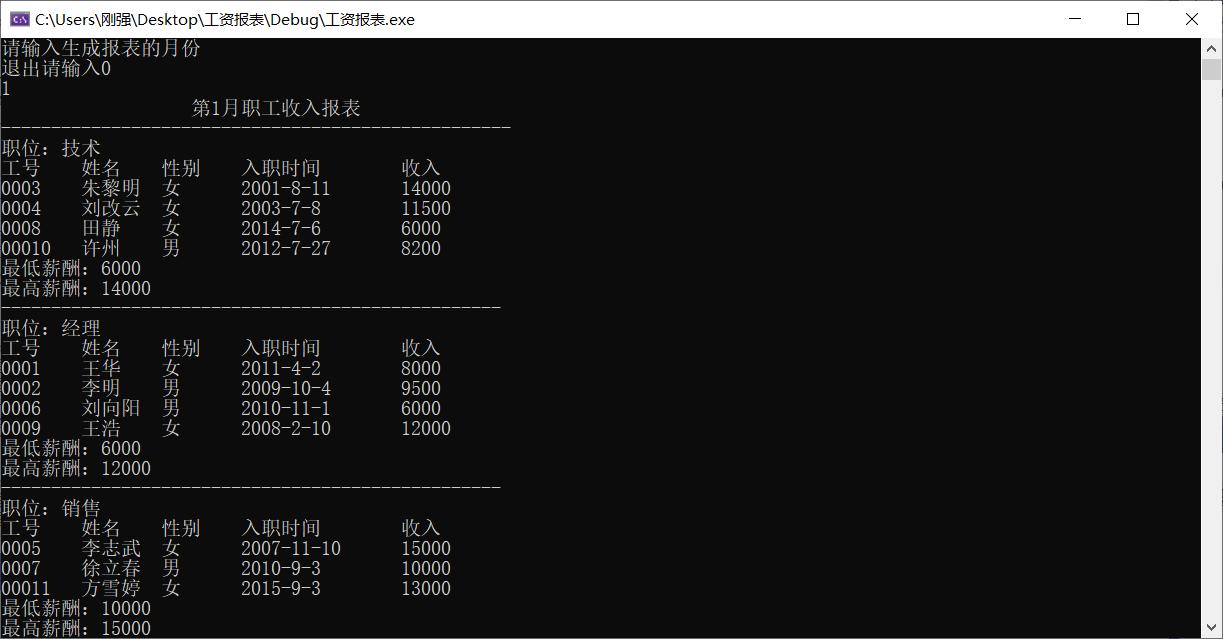 将想要得到工资报表的月份输入,输入1会得到1月份的员工收入报表,然后输入2,也将会得到2月份的员工收入报表,只有输入0才会退出程序。
