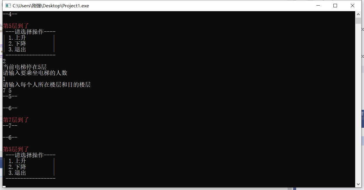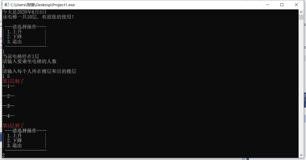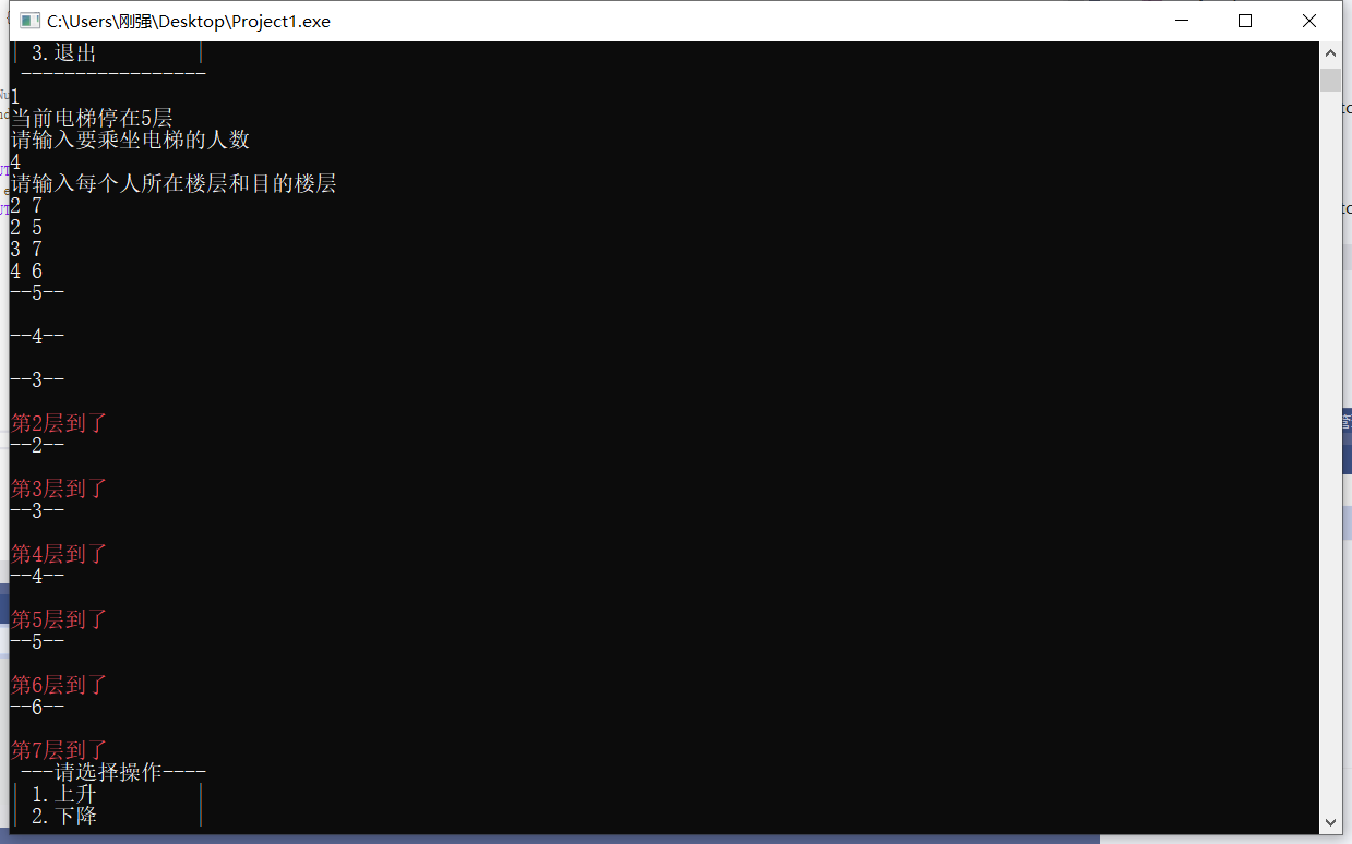 首先输出时间与地点等,输入1进行上升,输入将要乘坐电梯人数和所在楼层和目的楼层,实现了电梯的运行。然后输入2进行下降,输入将要乘坐电梯人数和所在楼层和目的楼层,电梯会自动运行去接人,进而送达到地方。最后输入1进行上升,输入多人乘坐的所在楼层和目的楼层,电梯会自动去接不同乘客,进而把乘客送达到目的楼层。
