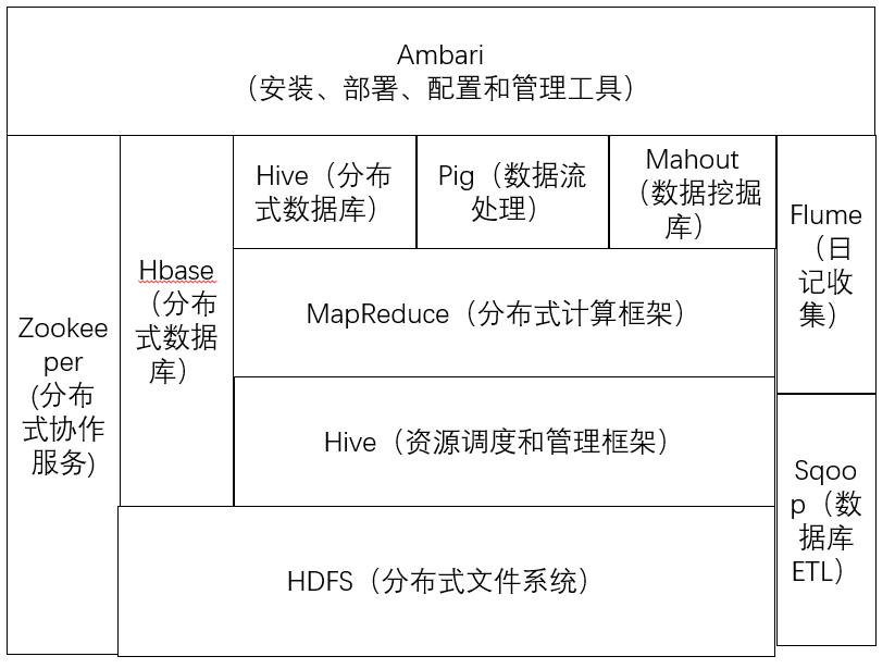 Hadoop对应于Google三驾马车:HDFS对应于GFS,即分布式文件系统,MapReduce即并行计算框架,HBase对应于BigTable,即分布式NoSQL列数据库,外加Zookeeper对应于Chubby,即分布式锁设施。