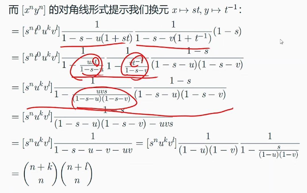 另外,对于 \([t^0]\frac{1}{1-at}\frac{1}{1-bt^{-1}}\) 这样的,其实等于 \(\frac{1}{1-ab}\) 。通过展开成不带分数的算式,可以发现这件事情。