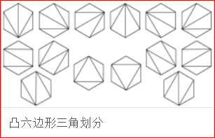 我们将凸多边形顶点从p1一直编号到pn,以p1pn这条边为基准,任选一个数k(2<=k<=n-1),将p1,pk以及pn三点连接,构成了一个三角形。该三角形把该凸边形划分成了两个凸边形,一边顶点为1 ~ k-1,另一边为k+1 ~ n,于是又回到了进出栈问题,所以答案依旧为:h(n)。