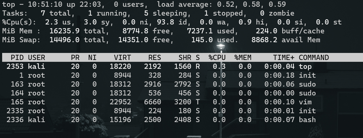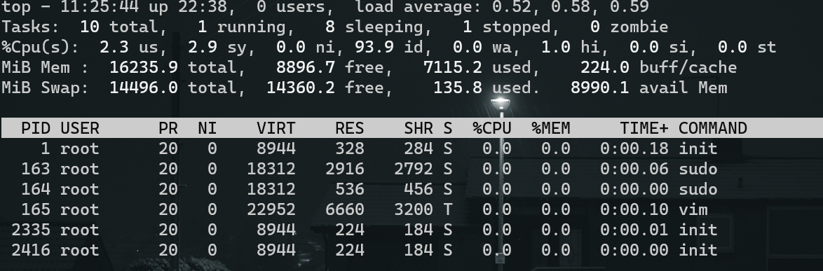 这里需要注意的是,load average 这 3 个输出值一般不能大于系统 CPU 的个数。例如,本测试系统有 8 个 CPU,如果 load average 中这 3 个值长期大于 8,就说明 CPU 很繁忙,负载很高,系统性能可能会受到影响;如果偶尔大于 8 则不用担心,系统性能一般不会受到影响;如果这 3 个值小于 CPU 的个数(如本例所示),则表示 CPU 是非常空闲的。