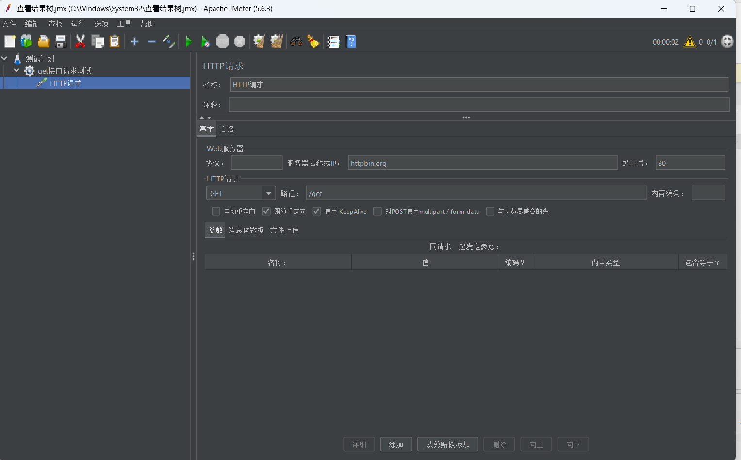 2. 添加HTTP请求(GET方法,服务器httpbin.org,路径/delay/1,模拟1秒响应接口)。