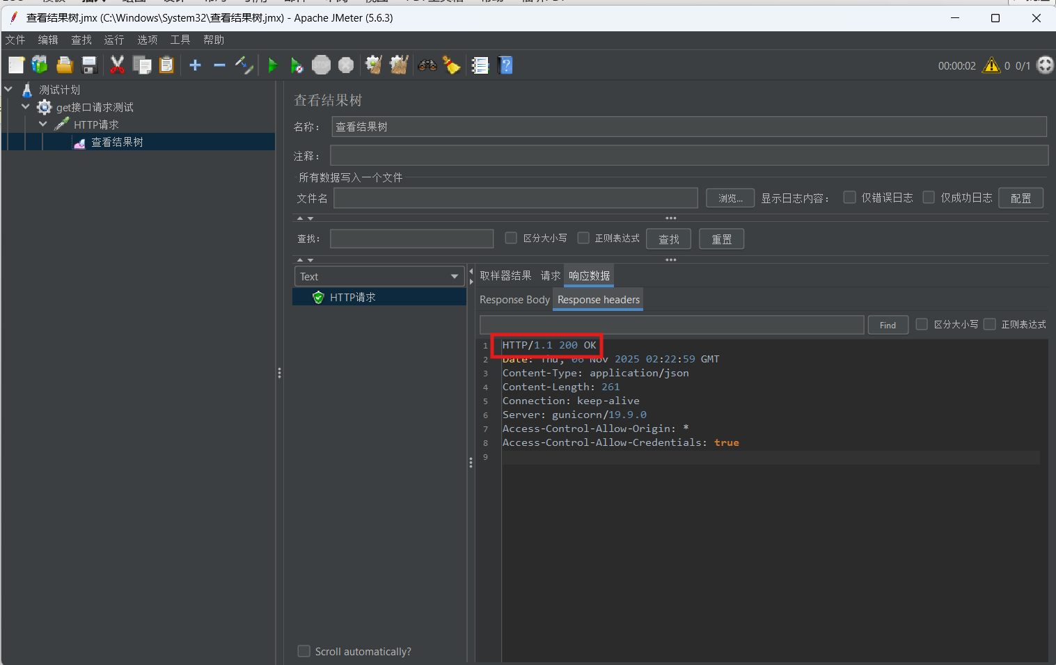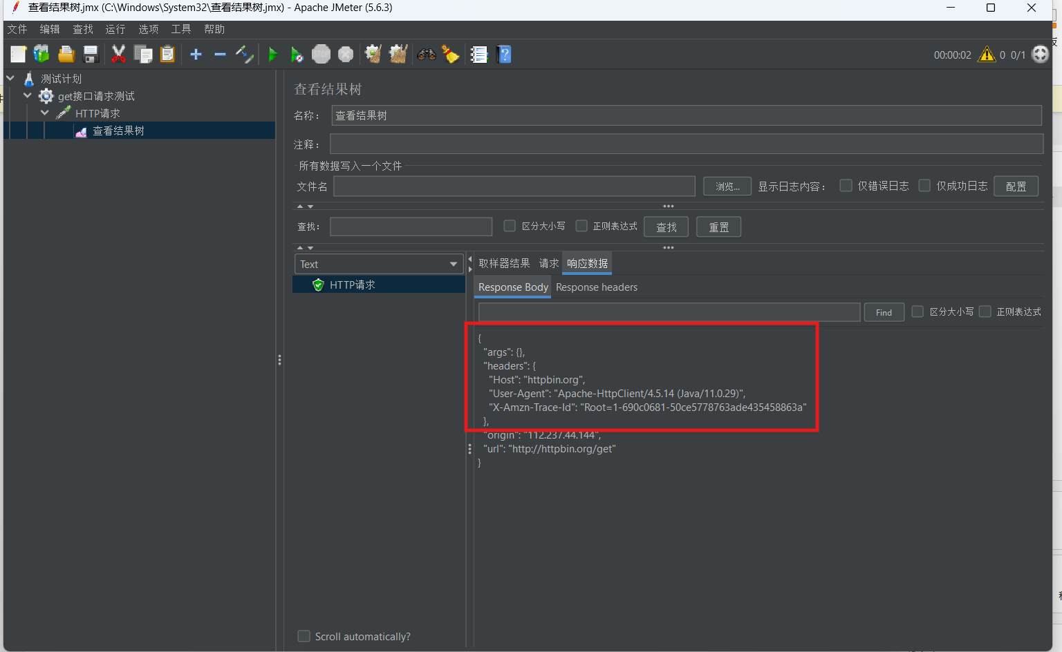 3. 添加“察看结果树”监听器,点击运行,验证响应状态码200及返回数据是否包含请求参数。![]()