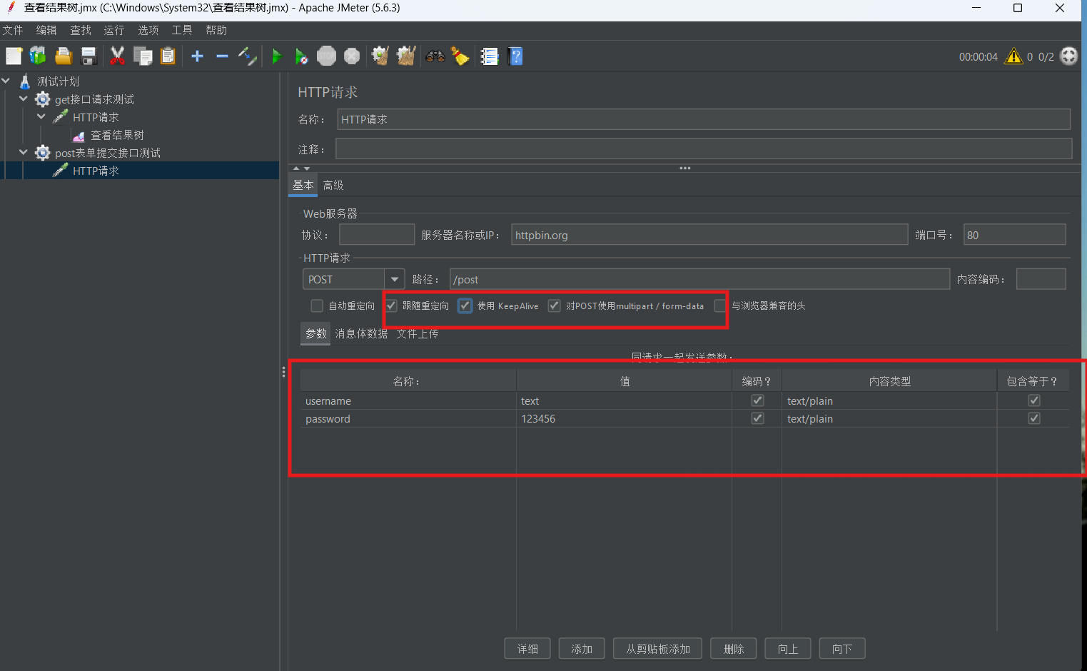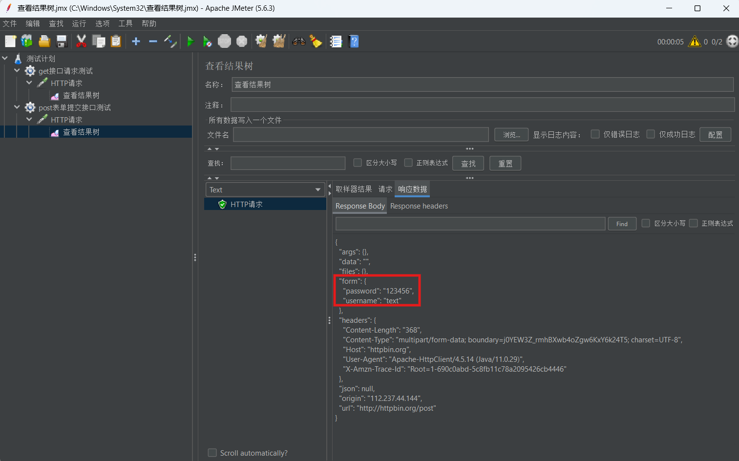 3. 添加“察看结果树”,运行后查看响应体中form字段是否包含提交的参数。![]()