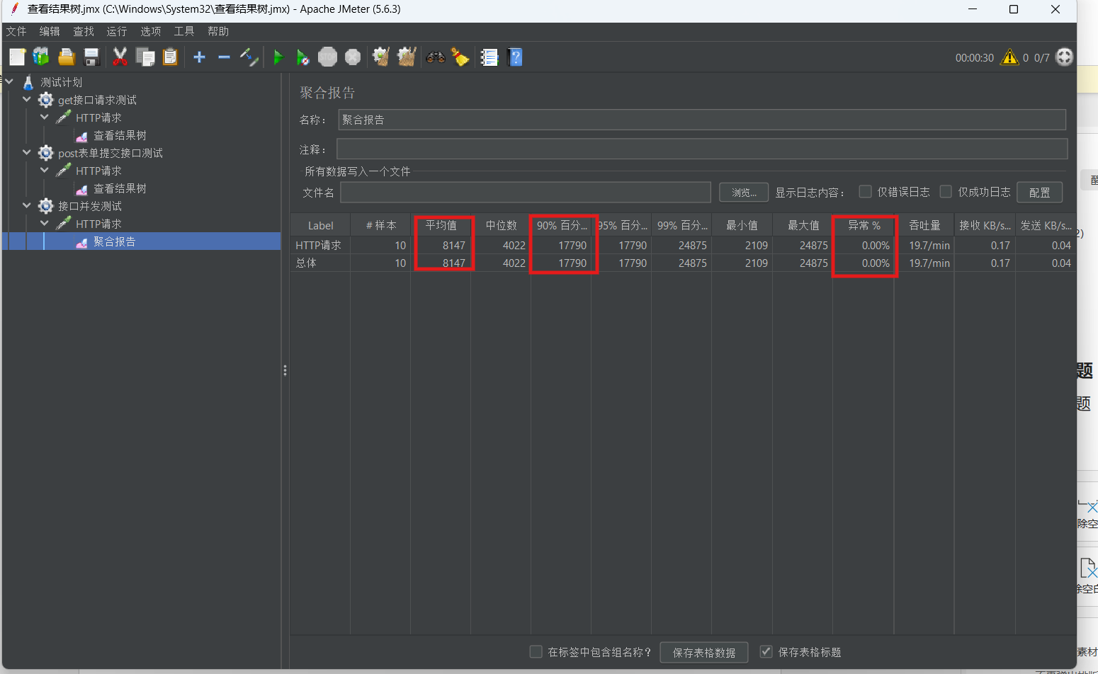 3. 添加“聚合报告”监听器,运行后查看平均响应时间、90%响应时间、成功数等并发指标。![]()