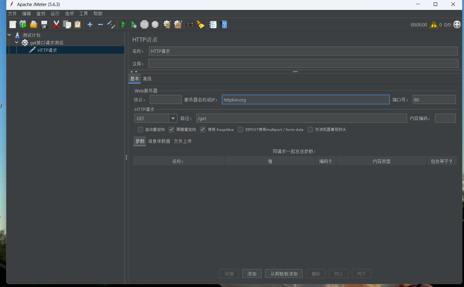 2. 线程组下添加“HTTP请求”,服务器名称/IP填写httpbin.org,端口80,请求方法选GET,路径填写/get。![]()