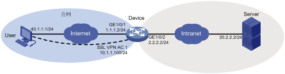 Device为SSL VPN网关设备,连接公网用户和企业私有网络。用户通过Device可以通过IP