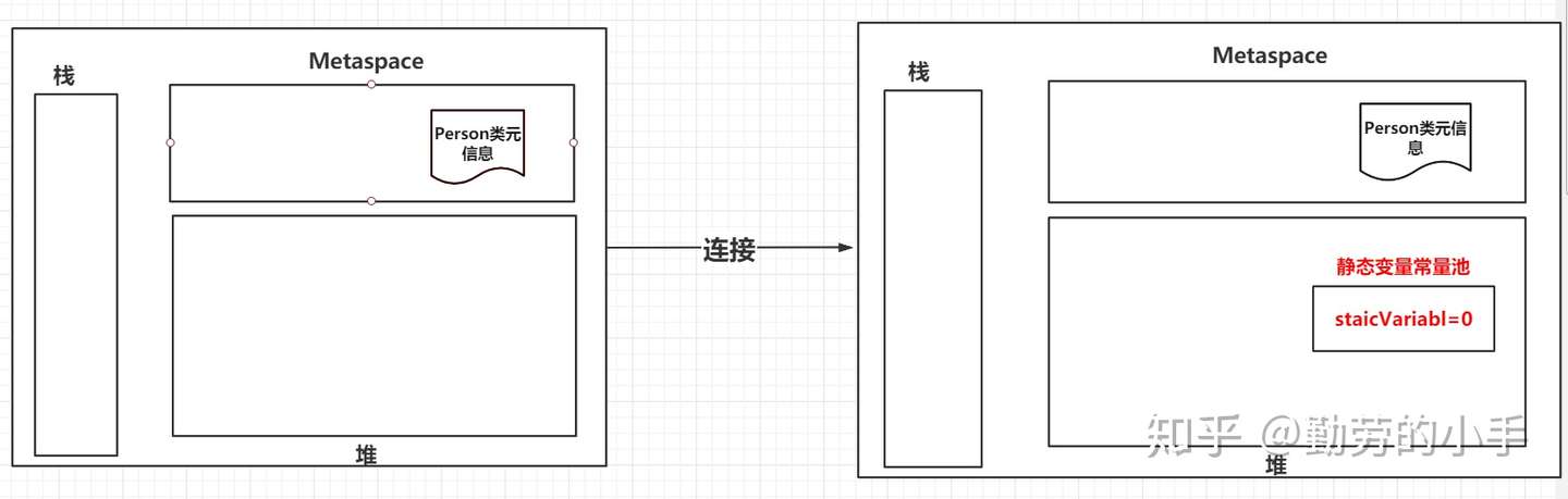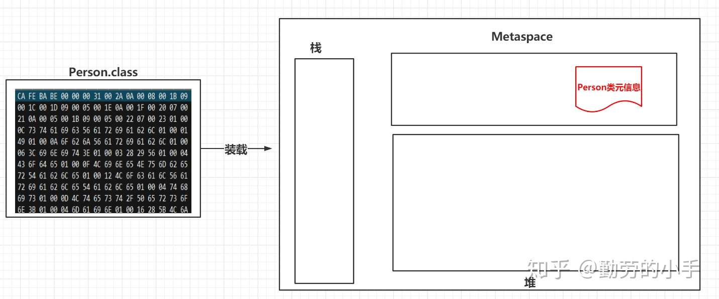 Person.class经过加载后,会把类的相关信息加载到JVM内存中,解析出类的描述信息会保存到Metaspace。