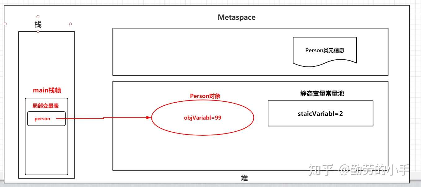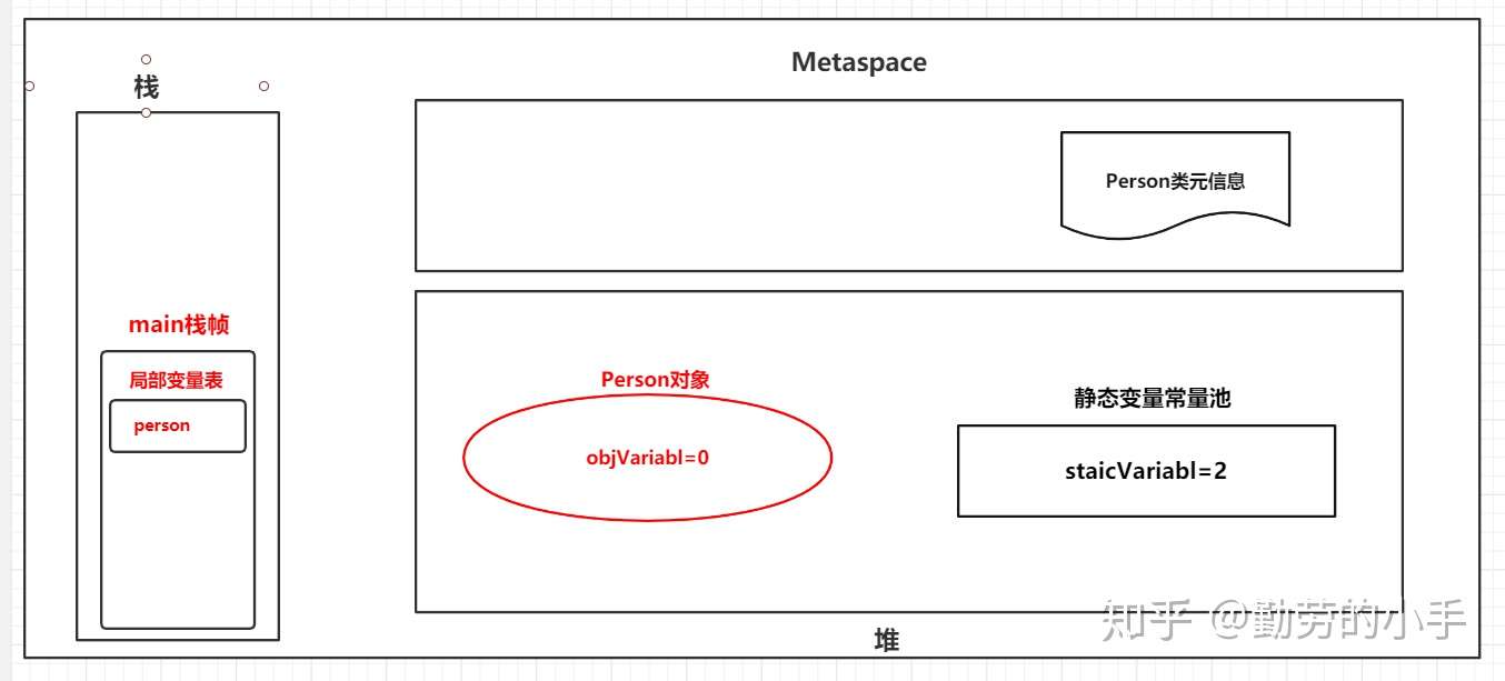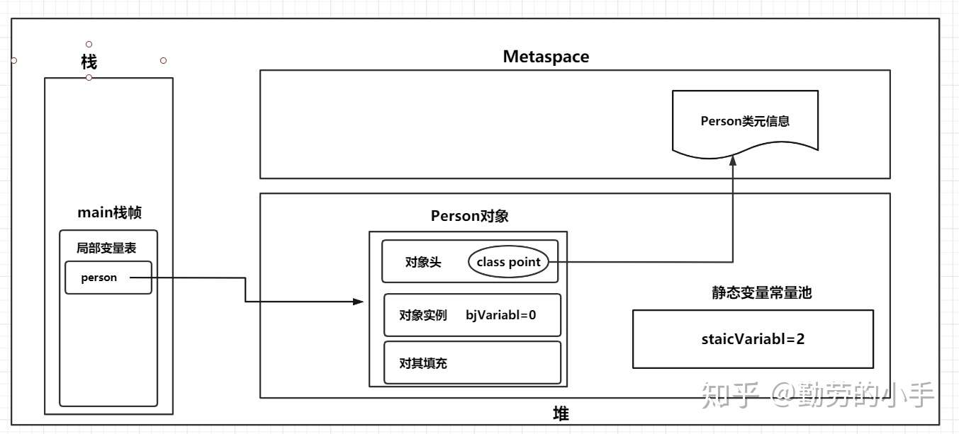 1、构建对象:首先main线程会在栈中申请一个自己的栈空间,然后调用main方法后会生成一个main方法的栈帧。然后执行new Person() ,这里会根据Person类元信息先确定对象的大小,向JVM堆中申请一块内存区域并构建对象,同时对Person对象成员变量信息并赋默认值。
