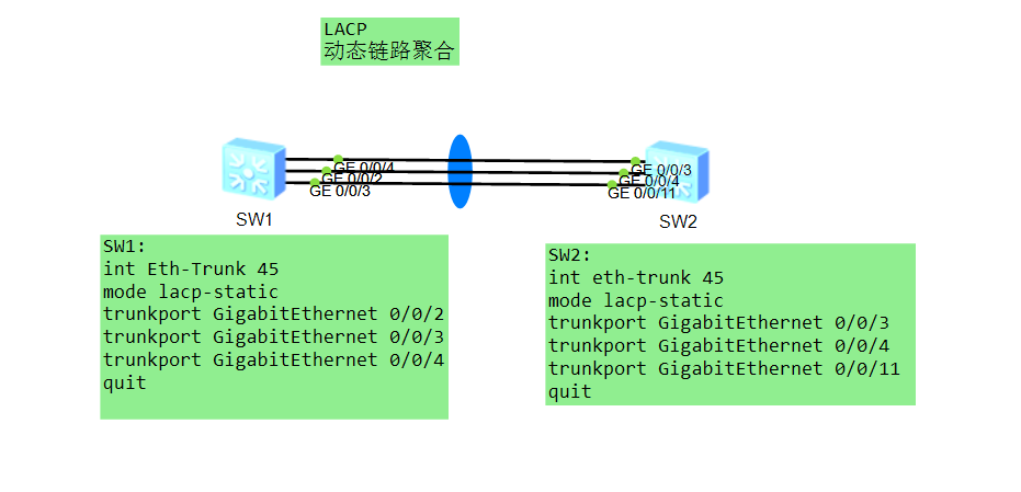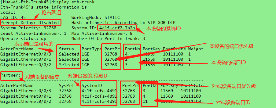 slow: 指定lacp模式下eth-trunk接口接收报文的超时时间为90秒,发送lacp报文周期为30秒,响应性能较fast低,但占用系统资源较少。