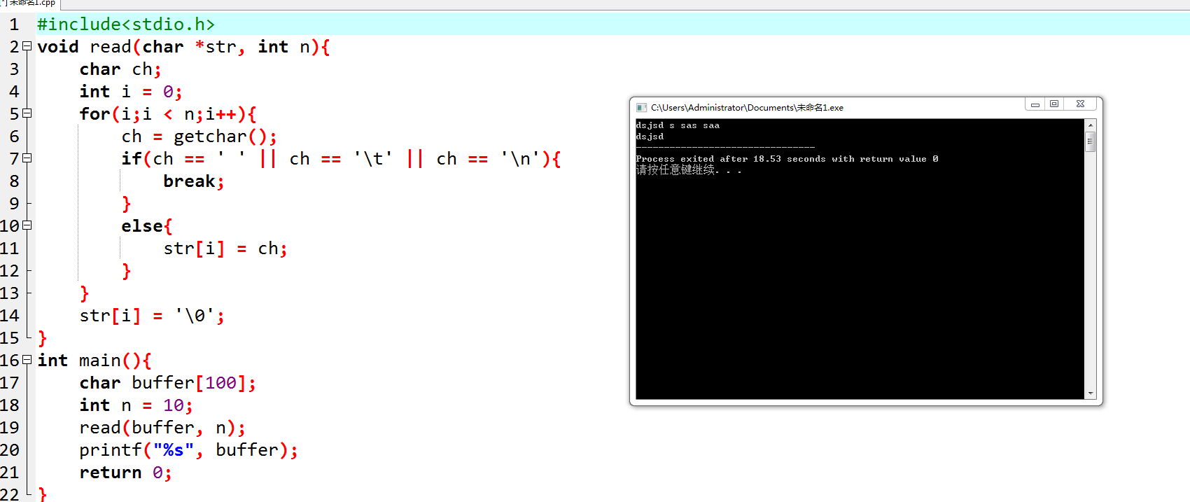 3.设计并测试一个函数,从一行输入中把一个单词读入一个数组中,并丢弃输入行中的其余字符。该函数应该跳过第1个非空白字符前面的所有空白。将一个单词定义为没有空白、制表符或换行符的字符序列。