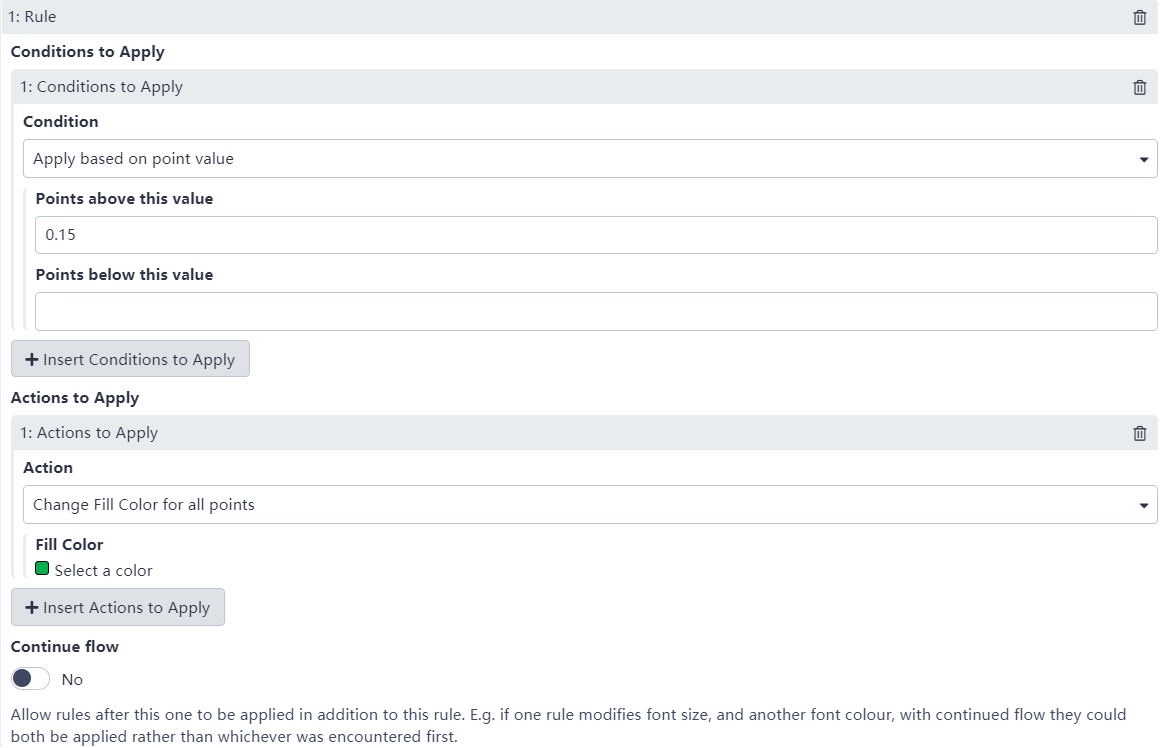 插入两条规则,第一条规定点的值在0.15以上的显示为绿色: