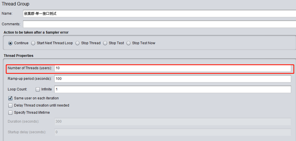 2) Thread Group :线程组,用来模拟用户发送请求,可以通过设置Number of Threads设置并发请求数量。Ramp-up period表示完成线程创建的时间,比如图中线程数为10,Ramp-up period为100,则线程的启动时间间隔为100/10=10秒,即每十秒会创建一个线程,共100秒完成; Loop Count为循环次数,默认为1,勾选Infinite则无限循环;Same user on eacd iteration指的是在当前线程组里面,每一次循环都使用相同的用户;specify Thread lifetime(调度器)指的是整个线程运行的时间。