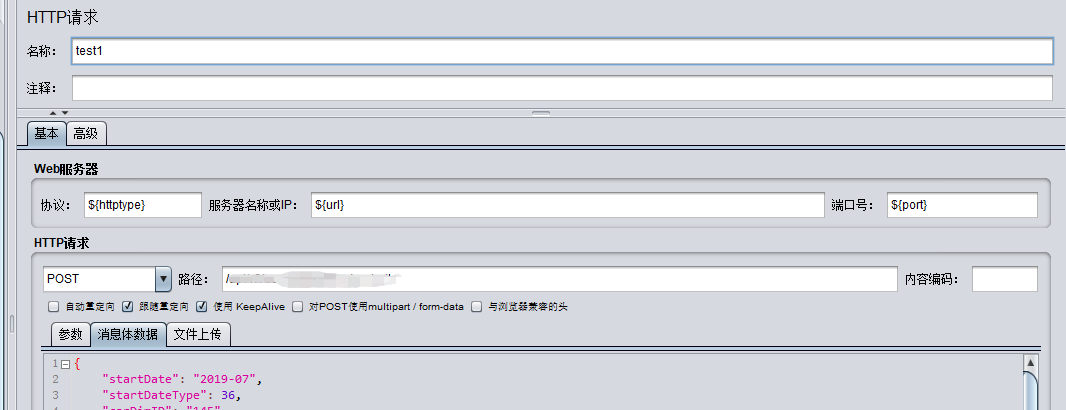 3) HTTP Request (Sampler) :用来定义请求的相关信息。按需填入相关信息即可;注意当访问的接口涉及到修改mysql数据库时,如果请求json中包含中文字符,可能需要将内容编码填入UTF-8,防止数据库乱码。