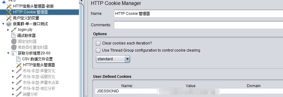 2) HTTP Cookie 管理器 :用于管理Test Plan运行时的所有Cookie;它可以自动储存服务器发送给客户端的所有Cookie,并在发送请求时附加上合适的Cookie.也可以在HTTP Cookie Manager中手动添加一些Cookie。