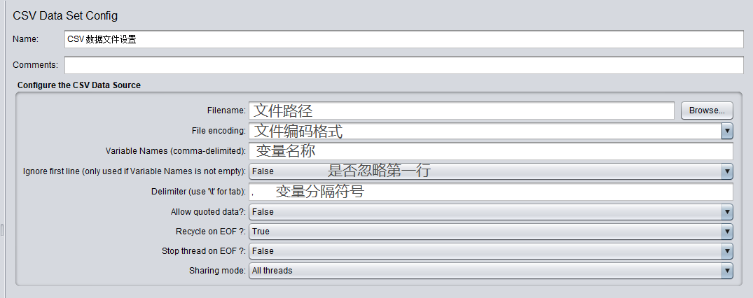 4) CSV Data Set Config :用于调取外部参数使用,可以和循环控制器配合使用,达成不同的请求排列组合