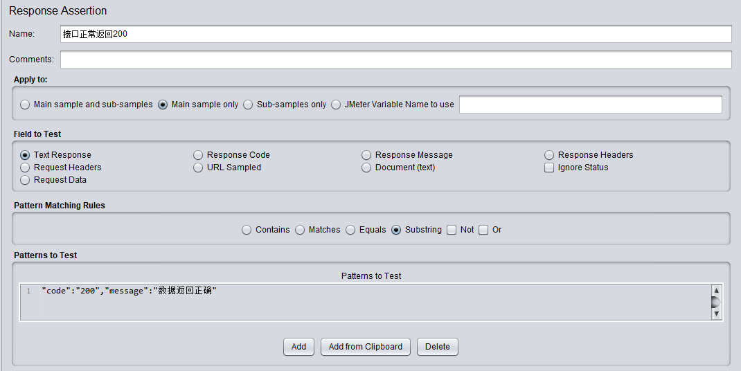 5) Response Assertion :响应断言。Pattern Matching Rules部分可以设置匹配规则;Patterns to Test模块可以输入需要断言的字符;如图则表示接口返回值内需要包含该字符串。