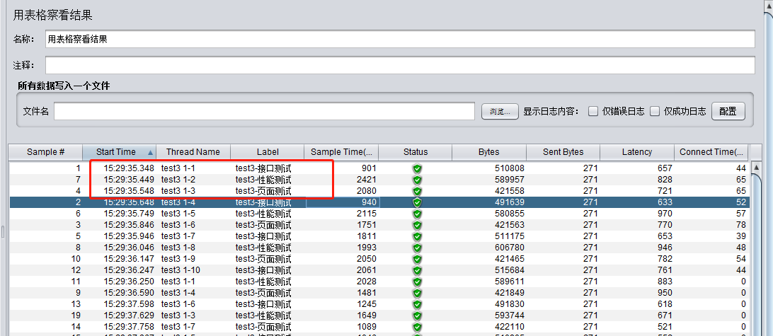 这个时候去查看表格结果会发现查询的顺序其实是:接口->性能->页面->接口...进行查询的