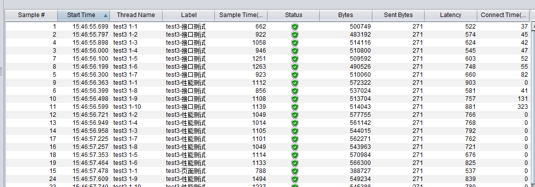 此时运行会发现查询的顺序是:10个线程同时去访问“接口测试”,当其中给某个线程完成这个接口请求后再去发送下一个"性能测试"的接口,依次查询到全部返回数据。整体还是呈现出 10个接口 - > 10个性能 - > 10个页面 这种顺序。
