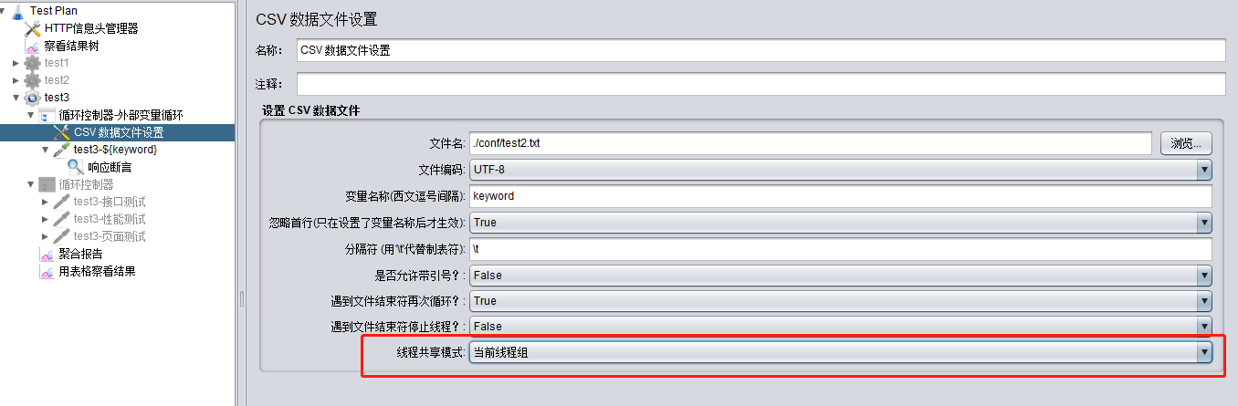 查询后发现是一中在设置CSV文件线程共享模式时,将模式设置为了当前线程组 ,而jmeter中当多个线程使用同一个文件内获取外部参数时,参数值会向后顺沿,比如当10个线程同时去文件中取值,那么第一个线程取到的keyword值为“接口测试”,第二个线程取到的值则是“性能测试”,第三个线程取到的则是“页面测试”如此循环。所以在10个线程运行时查询顺序会变为接口->性能->页面->接口...,而将共享模式切换为“当前线程”时,则相当于每一个线程都单独使用一个test2.txt文件,所以查询顺序会变为 10个接口 - > 10个性能 - > 10个页面这种顺序。