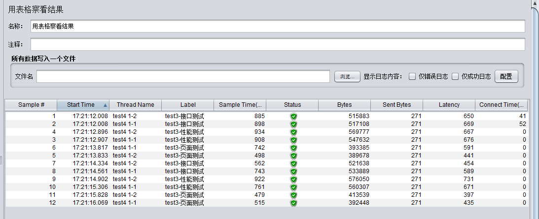 4. 进行压力测试时最好聚合报告、用表格查看结果和察看结果树(只显示错误日志)配合使用,聚合报告用来查看整体接口测试情况;用表格查看结果用来确认每个请求发送的时间间隔(适用于请求不是特别多的测试);察看结果树用来确定错误请求,方便查询服务器日志,加快问题定位。