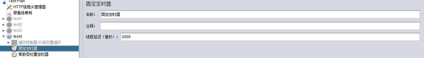 1)固定定时器用来设置请求延时的,比如图中设置时长为2000ms,则表示在每个线程中的每个请求之间间隔2s;