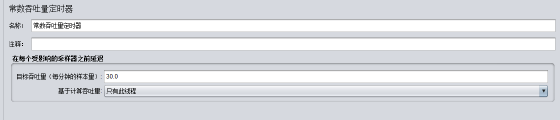 2)常熟吞吐量定时器则用来设置当前线程每分钟发送的请求数量,即样本量;如图中设置的30/60=1/2 则表示单一线程内每2秒发送一个请求。