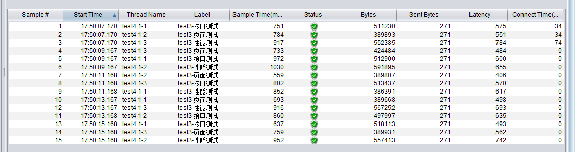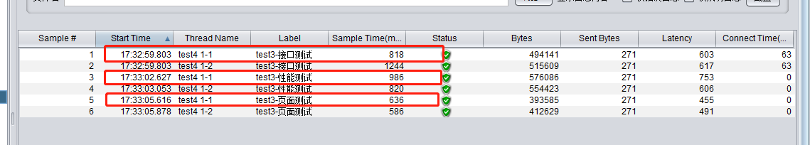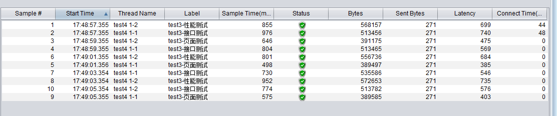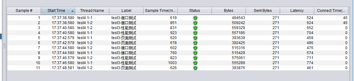 如图中可看出test4 1-1 这个线程的时间间隔大概为2s,但是相同接口1-1中发送的时间与1-2中发送的时间并不一样。如果对发送时间有严格要求的压力测试可能就不能够仅仅使用固定定时器来达到效果。