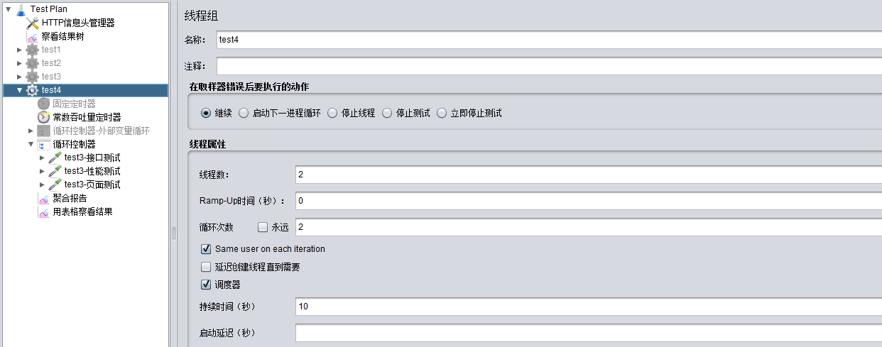 如果只是单一的配置以上信息,那么整个线程会按照线程内的请求开始循环,持续10s之后停止进程 (下图中没有持续10秒是因为整个线程+循环的总时长在10秒之内已经完成了)