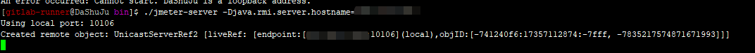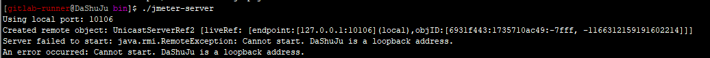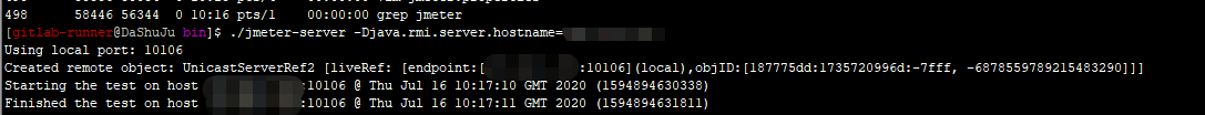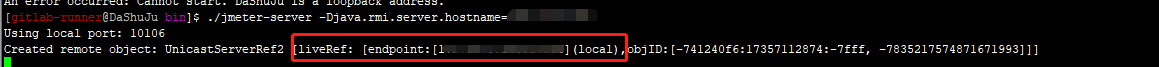 如果遇到上面这种情况,就使用以下命令启动服务 ./jmeter-server -Djava.rmi.server.hostname=主机ip ,主机IP为slave机器的ip;启动成功展示如下: