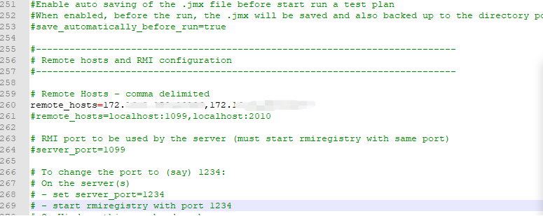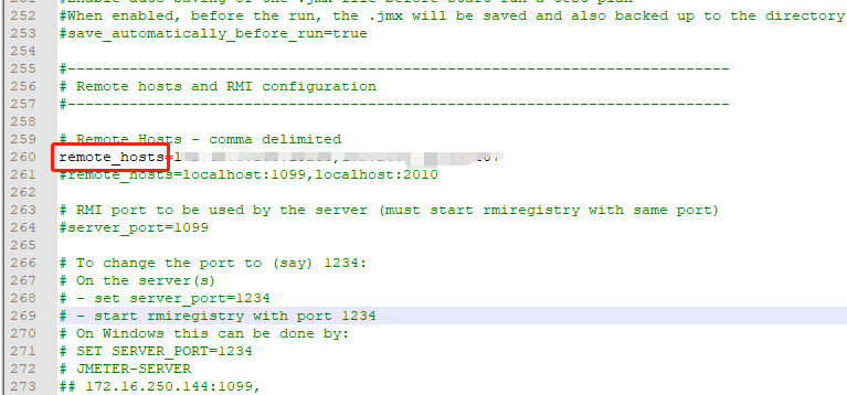 2.修改了slave机器的端口需要在master机器上对应修改配置的slave服务,将jmeter.properties文件中remote_hosts后的IP地址机端口修改为slave机器 新的IP和端口,保存文件,重启jmeter即可。