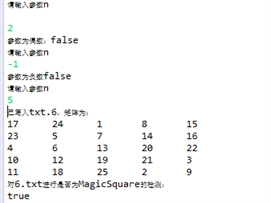 要求2:对给出的generateMagicSquare函数扩展,根据参数n生成一个MagicSquare并写入文本6.txt中,然后判断其是否为MagicSquare。输入为奇数能生成MagicSquare返回true,输入偶数或者负数会返回false。