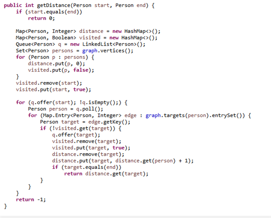 对于getDistance,设计test用例t,建立四个Person对象,执行addVertex后,执行addEdge后,最短距离正确即可。