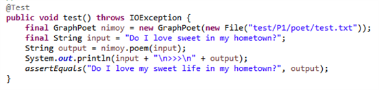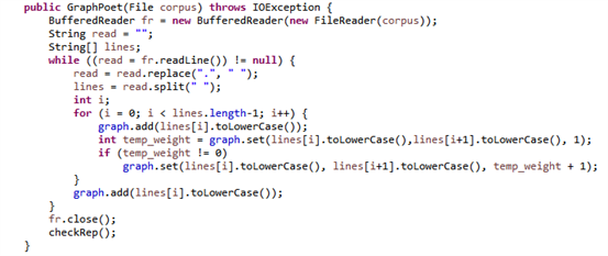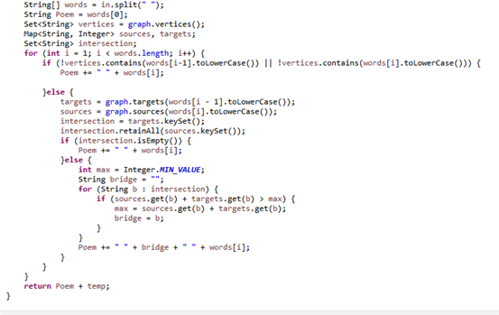 3. 基于创建好的Graph类,实现GraphPoet类,将语义库存入graph图中,然后利用GraphPoet类,根据graph中语义库的信息,对输入文本进行处理,若输入文本的两个单词之间存在桥接词,则插入桥接词;若存在多个单一桥接词,则选取边权重较大者。最终得到由输入文本创作的诗歌,