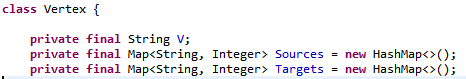 数据段 -V表示顶点,Sources表示以该顶点为终点的边的起点表,Targets表示以该顶点为起点的边的终点表,Map中String为顶点的对点,Integer为边的权值