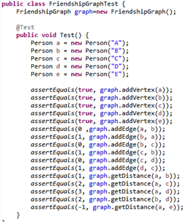 对于addEdge,设计test用例,建立四个Person对象,执行addVertex后,执行addEdge然后判断每个对象的friend中是否包含即可。