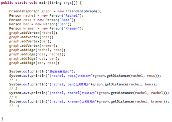 用Person和FriendshipGraph两个类模拟社交网络图,Person模拟图的顶点,FriendshipGraph模拟关系,getDistance能够计算出每两个Person之间的最短路径。