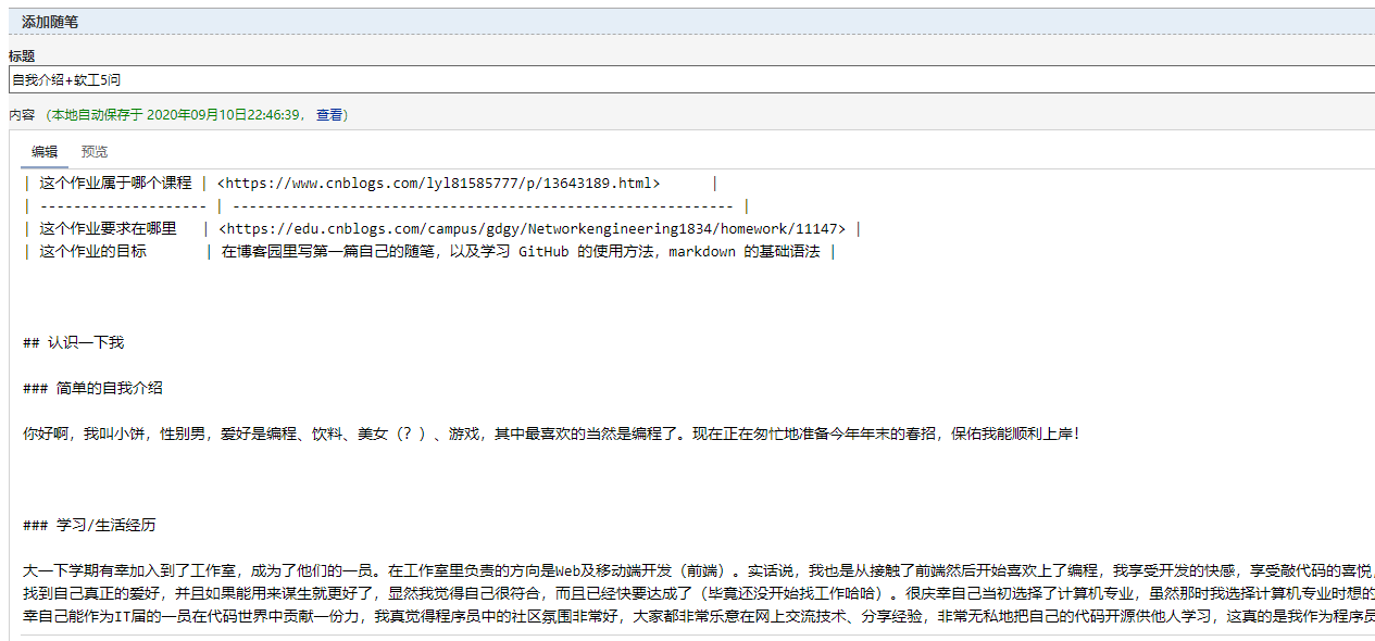| 这个作业的目标 | 在博客园里写第一篇自己的随笔,以及学习 GitHub 的使用方法,markdown 的基础语法 |