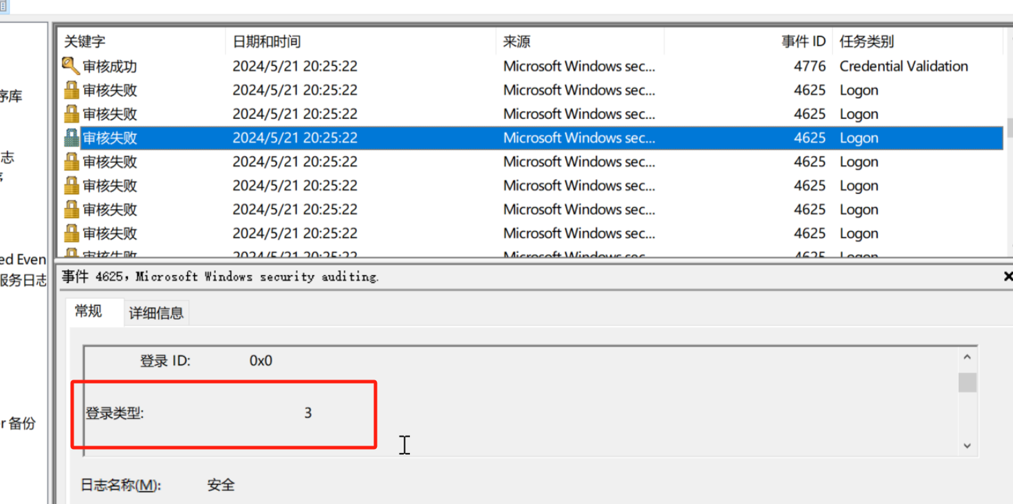在登陆失败的日志中,找到登陆类型为3。在暴力破解的情况下使用RDP爆破在日志中就会记录登陆类型为3
