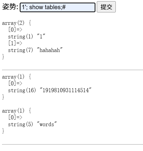 使用 1';show columns from words;# 查询words表时发现是有两个字段的
