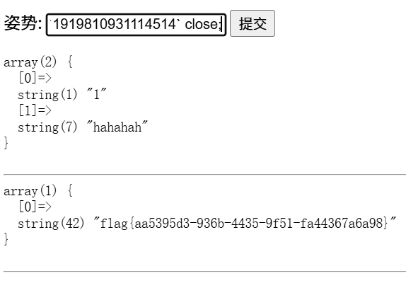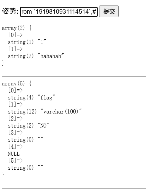 因此可以得到一个思路,我们把words表随便改成一个名字如test,然后把1919810931114514表改成words,再把列名flag改成id,就可以达到直接输出flag字段的值的效果