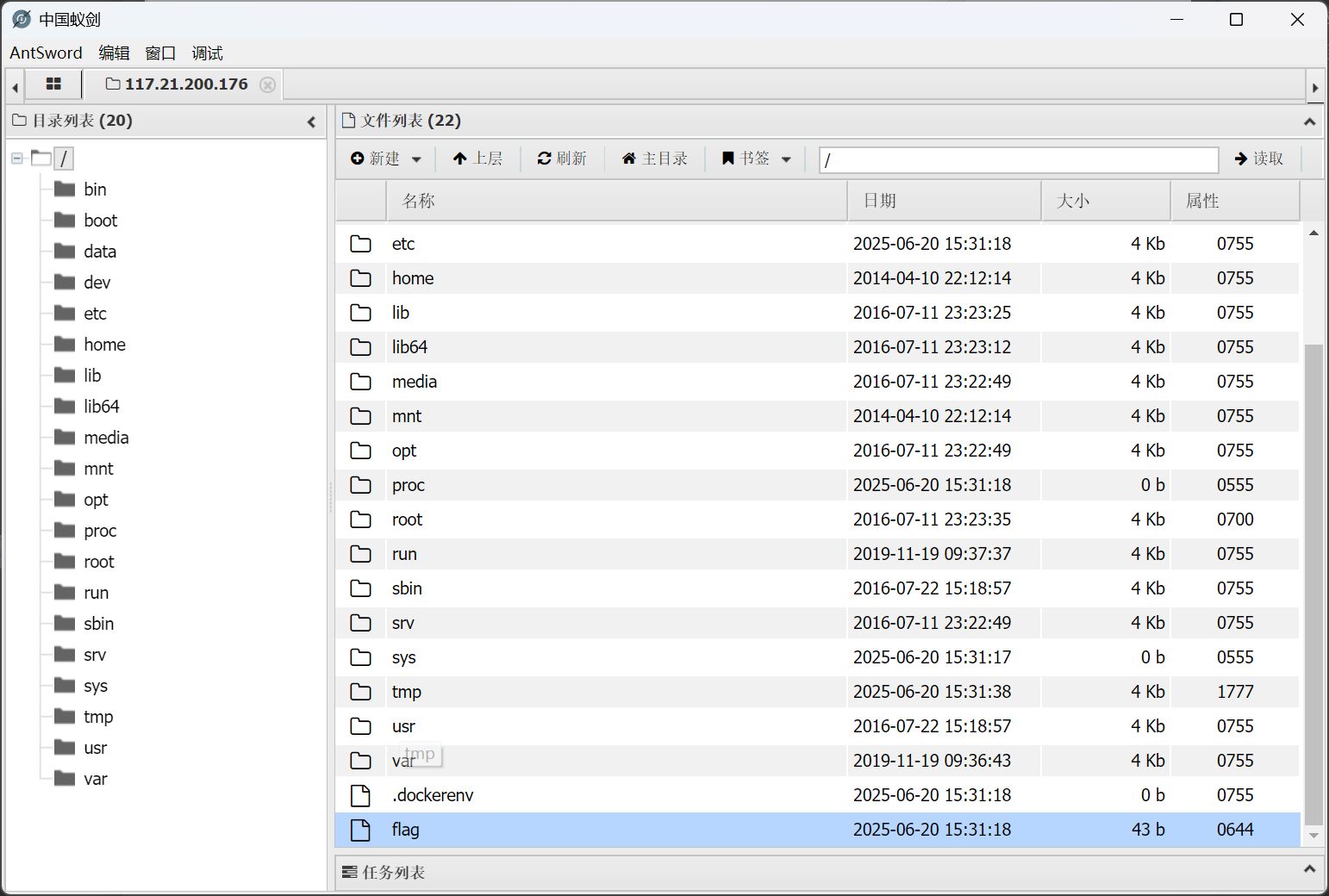 连接成功后在根目录下找到flag文件,若没找到flag或找到后打不开,可能是曾经使用过蚁剑,这里刷新一下就正常找到或打开文件