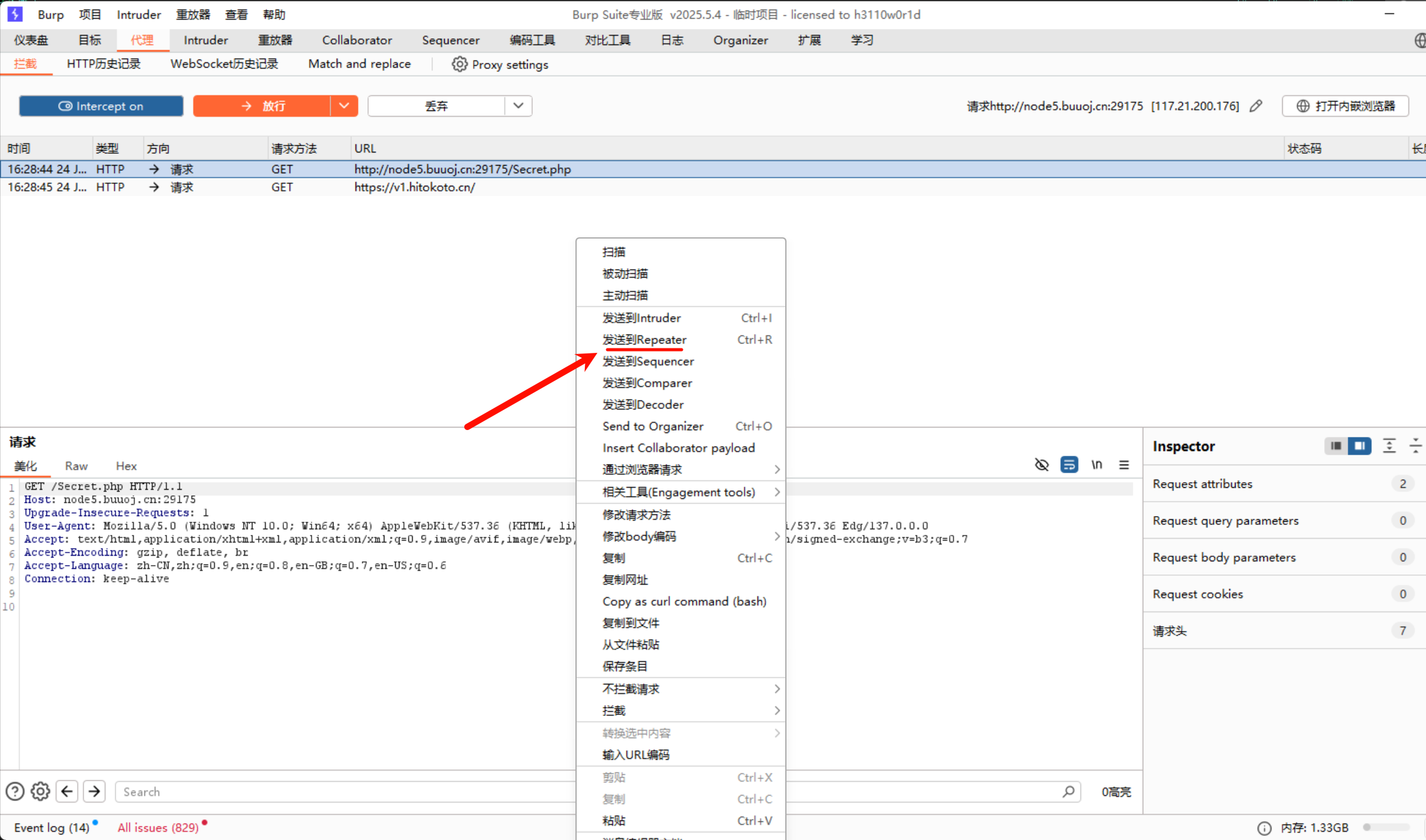 将抓到的包发往重放器里,我们在请求包中添加Referer头