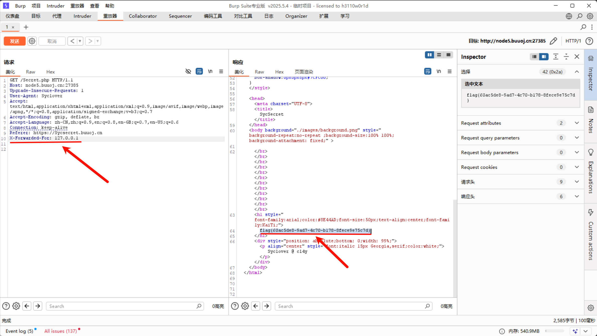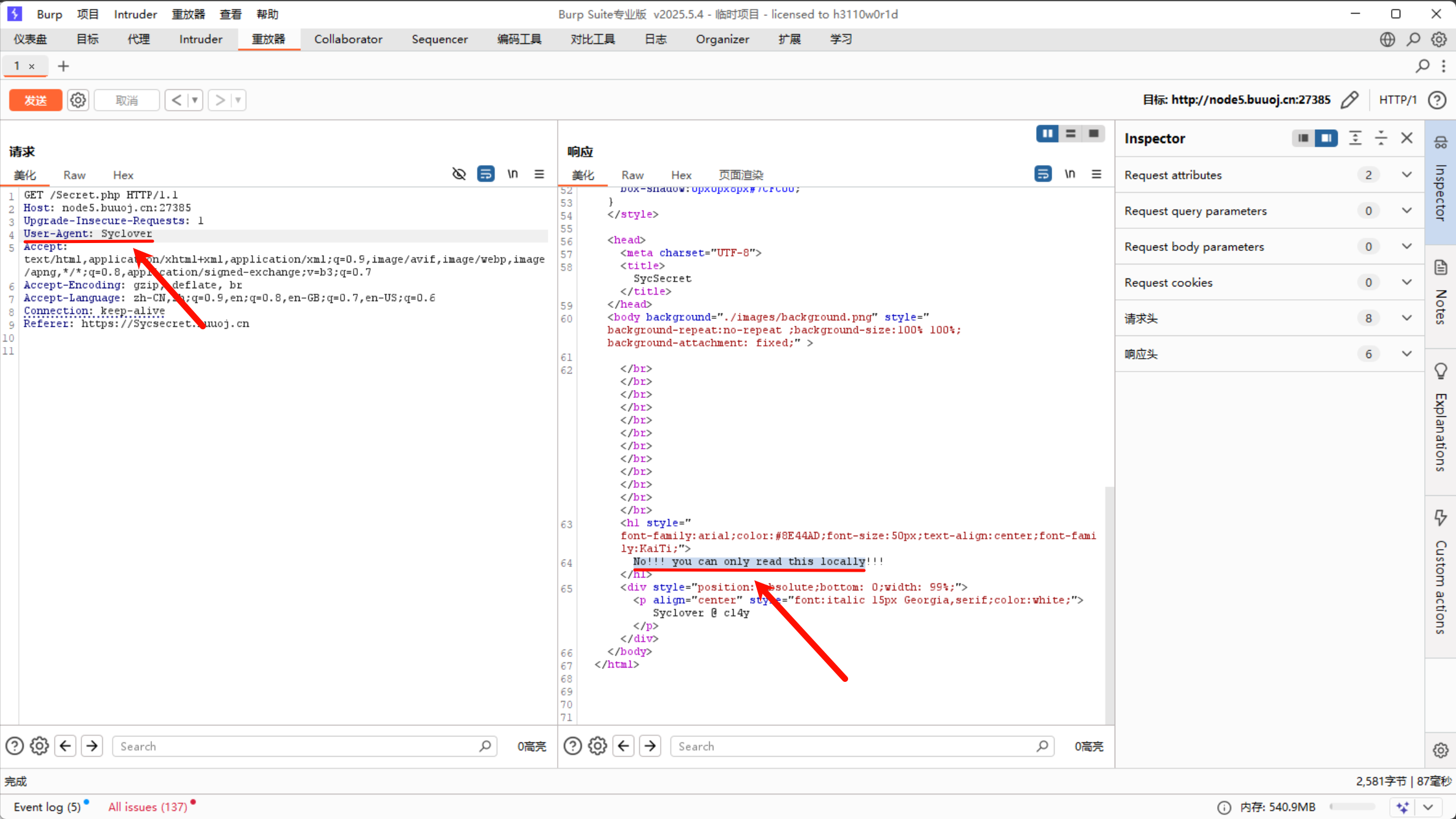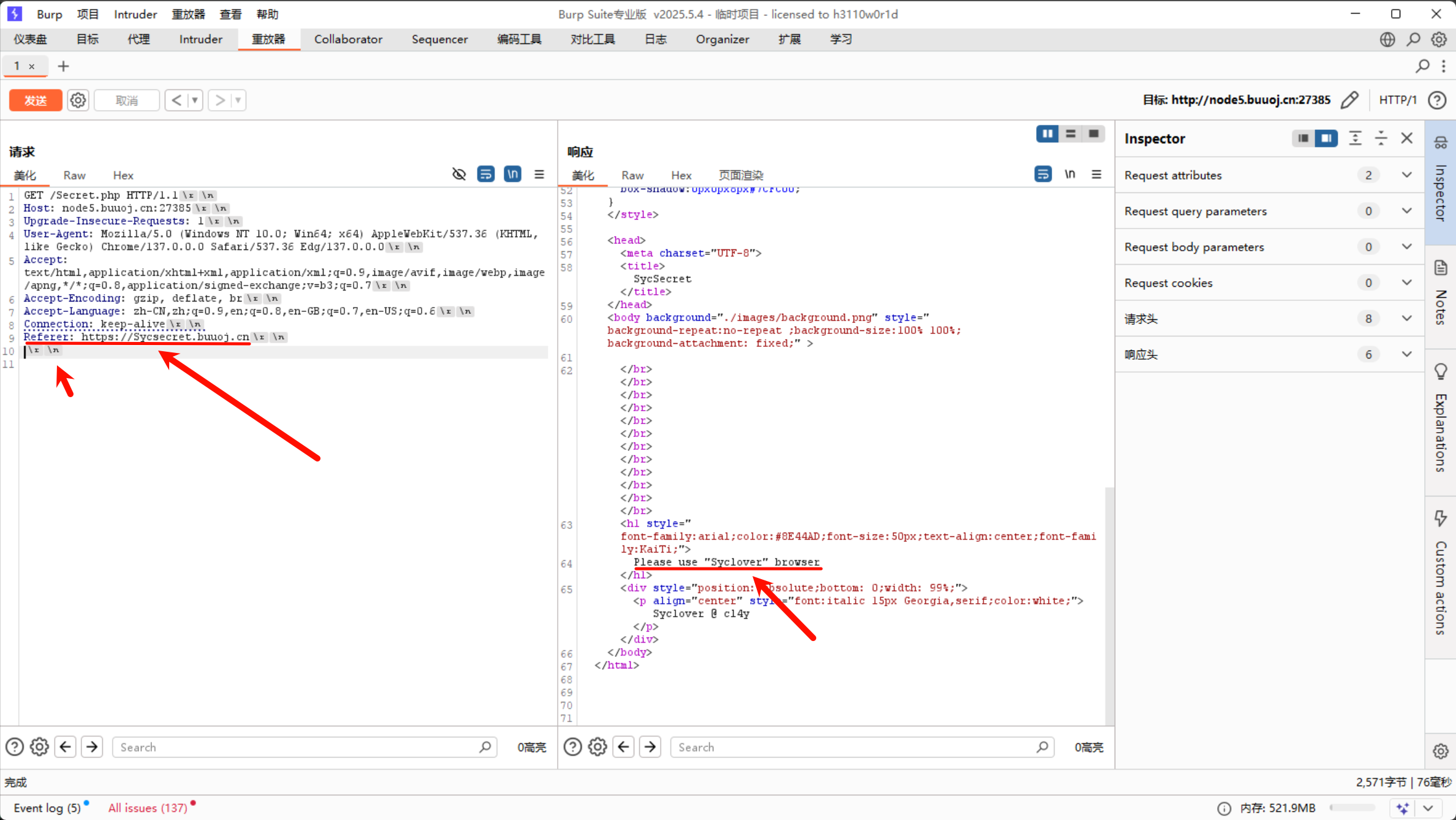 回显说明不是来自于https://Sycsecret.buuoj.cn这个网站,我们可以想到修改Referer来伪造请求头,我们使用burp抓包来修改请求头
