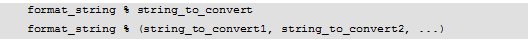 其中,format_string为格式标记字符串,包括固定的内容与待替换的内容,待替换的内容用格式化符号标明,string_to_convert为需要格式化的数据。如果需要格式化的数据是多个,则需要使用小括号括起来并用逗号分隔。