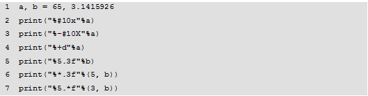 在例中,第2行输出字符串宽度为10,并且以0x形式显示65对应的十六进制数,注意默认是右对齐的。第3行输出字符串宽度为10,并且以0X形式显示65对应的十六进制数,注意“-”代表左对齐。第4行输出字符串中正值时前加“+”。第5行输出字符串宽度为5,显示的小数点精度为3。第6行通过*设置显示宽度为5。第7行通过*设置小数点精度为3。