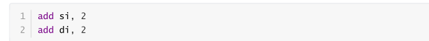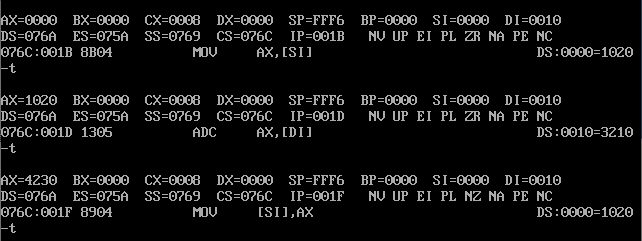 1 assume cs:code, ds:data 2 3 data segment 4 x dw 1020h, 2240h, 9522h, 5060h, 3359h, 6652h, 2530h, 7031h 5 y dw 3210h, 5510h, 6066h, 5121h, 8801h, 6210h, 7119h, 3912h 6 data ends 7 code segment 8 start: 9 mov ax, data 10 mov ds, ax 11 mov si, offset x 12 mov di, offset y 13 call add128 14 15 mov ah, 4ch 16 int 21h 17 18 add128: 19 push ax 20 push cx 21 push si 22 push di 23 24 sub ax, ax 25 26 mov cx, 8 27 s: mov ax, [si] 28 adc ax, [di] 29 mov [si], ax 30 31 inc si 32 inc si 33 inc di 34 inc di 35 loop s 36 37 pop di 38 pop si 39 pop cx 40 pop ax 41 ret 42 code ends 43 end start