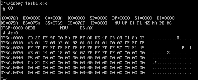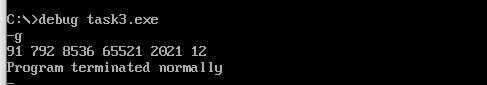 1 assume ds:data, cs:code 2 3 data segment 4 x dw 91, 792, 8536, 65521, 2021,12 5 len equ $ - x 6 data ends 7 8 code segment 9 start: 10 mov ax, data 11 mov ds, ax 12 13 mov cx, len/2 14 15 s: 16 mov ax,ds:[di] 17 add di, 2 18 19 push cx 20 21 call printNumber 22 call printSpace 23 24 pop cx 25 loop s 26 27 mov ah, 4ch 28 int 21h 29 30 printNumber: 31 mov bx, 0 32 33 s1: 34 mov si, 10 35 mov dx, 0 36 div si 37 38 push dx 39 inc bx 40 41 cmp ax,0 42 jne s1 43 44 45 mov cx, bx 46 47 s2: 48 pop dx 49 add dl, 30h 50 mov ah, 2 51 int 21h 52 loop s2 53 54 ret 55 56 57 printSpace: 58 mov ah, 2 59 mov dl, 20h 60 int 21h 61 ret 62 63 code ends 64 end start