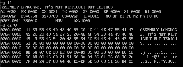 1 assume cs:code, ds:data 2 data segment 3 str db 80 dup(?) 4 data ends 5 6 code segment 7 start: 8 mov ax, data 9 mov ds, ax 10 mov si, 0 11 s1: 12 mov ah, 1 13 int 21h 14 mov [si], al 15 cmp al, '#' 16 je next 17 inc si 18 jmp s1 19 next: 20 mov ah, 2 21 mov dl, 0ah 22 int 21h 23 24 mov cx, si 25 mov si, 0 26 s2: mov ah, 2 27 mov dl, [si] 28 int 21h 29 inc si 30 loop s2 31 32 mov ah, 4ch 33 int 21h 34 code ends 35 end start